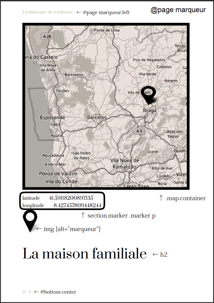 Le texte en haut de la page à gauche « Un itinéraire de tendresse » correspond à @page marqueur:left. J’ai déterminé la police de caractère (font-family : var(–texte-font) ; ), sa taille (font-size : 8pt ; ) et sa couleur (color : var(–couleur-trois) ; ).